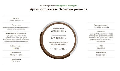Дворец получил грант по итогам участия в первом грантовом конкурсе Президентского фонда Культурных инициатив, на который представил свой проект арт-пространство «Забытые ремесла».